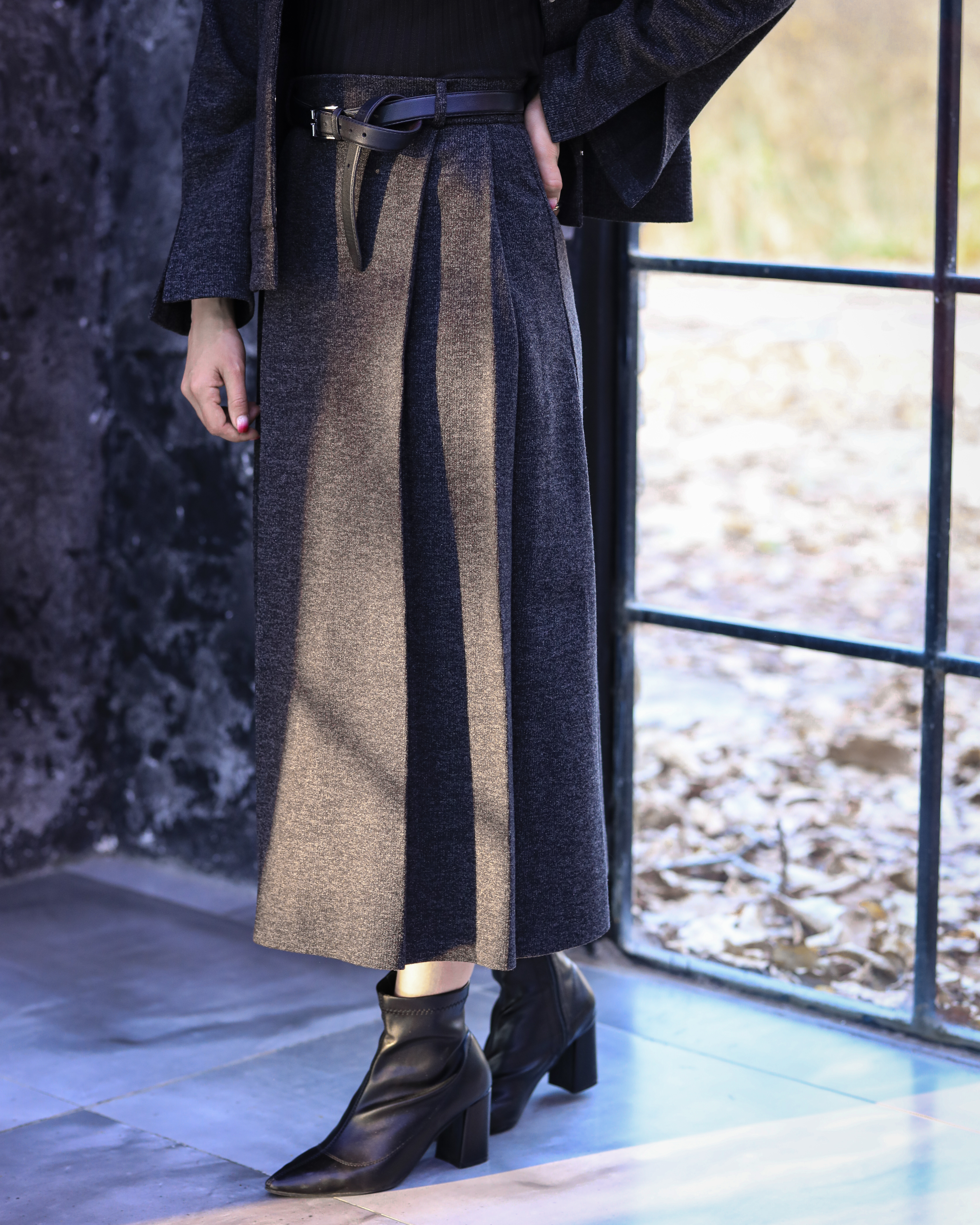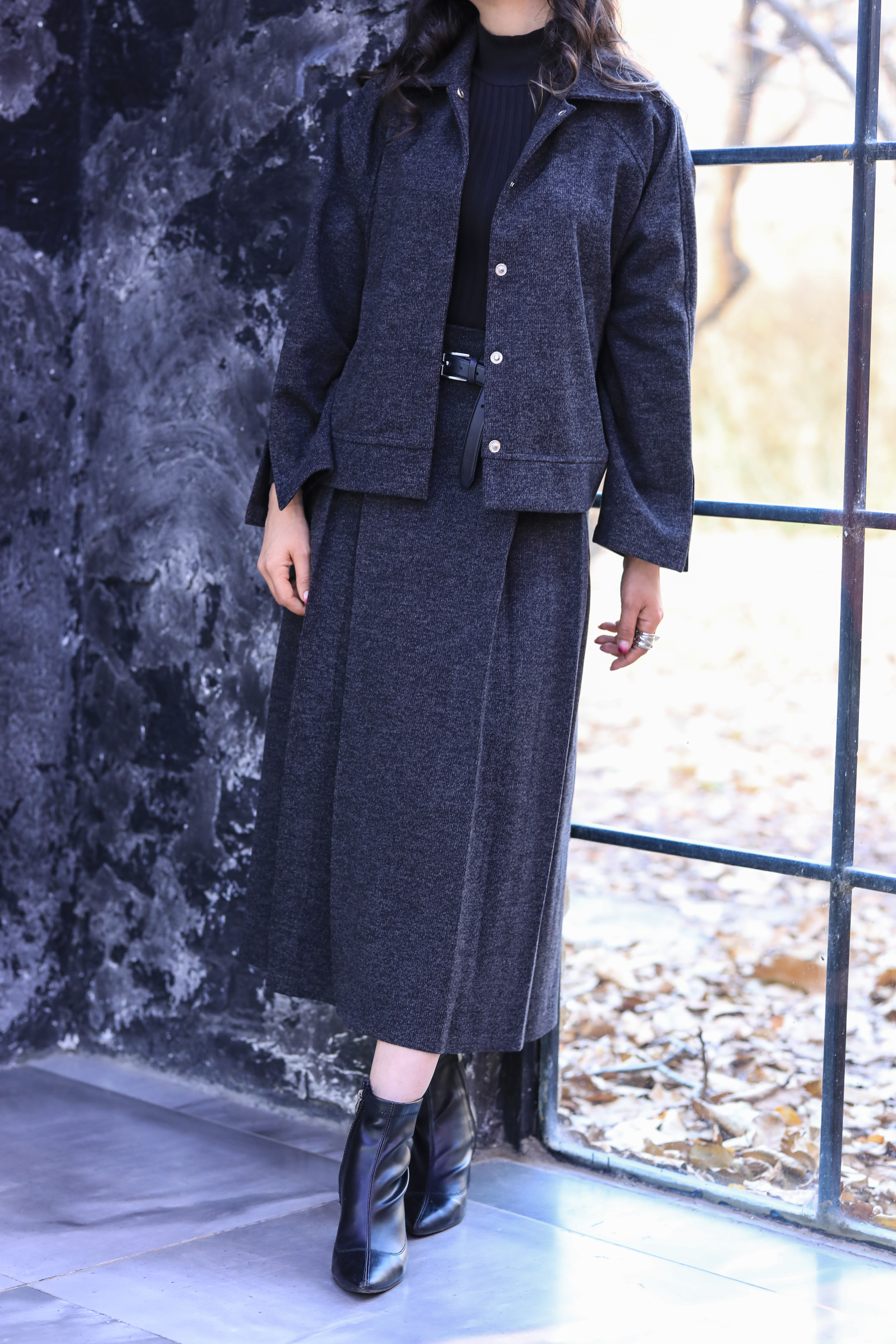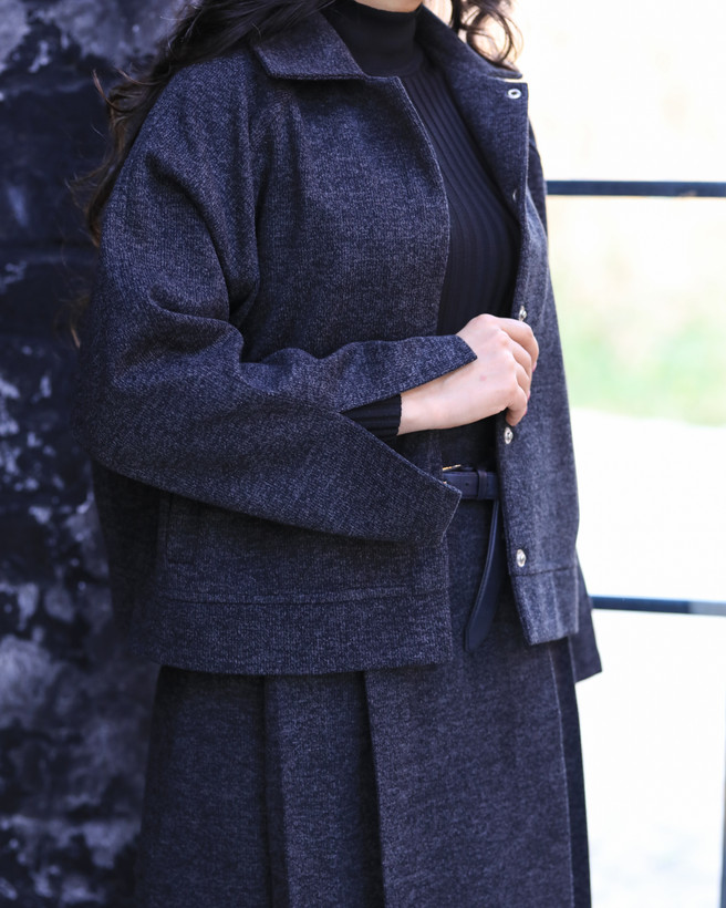 کت دارای برش حرفهای و ایست زیبا روی بدن است و دامن آن بهخوبی با فرم کت هماهنگ شده تا استایلی منسجم و شیک بسازد.