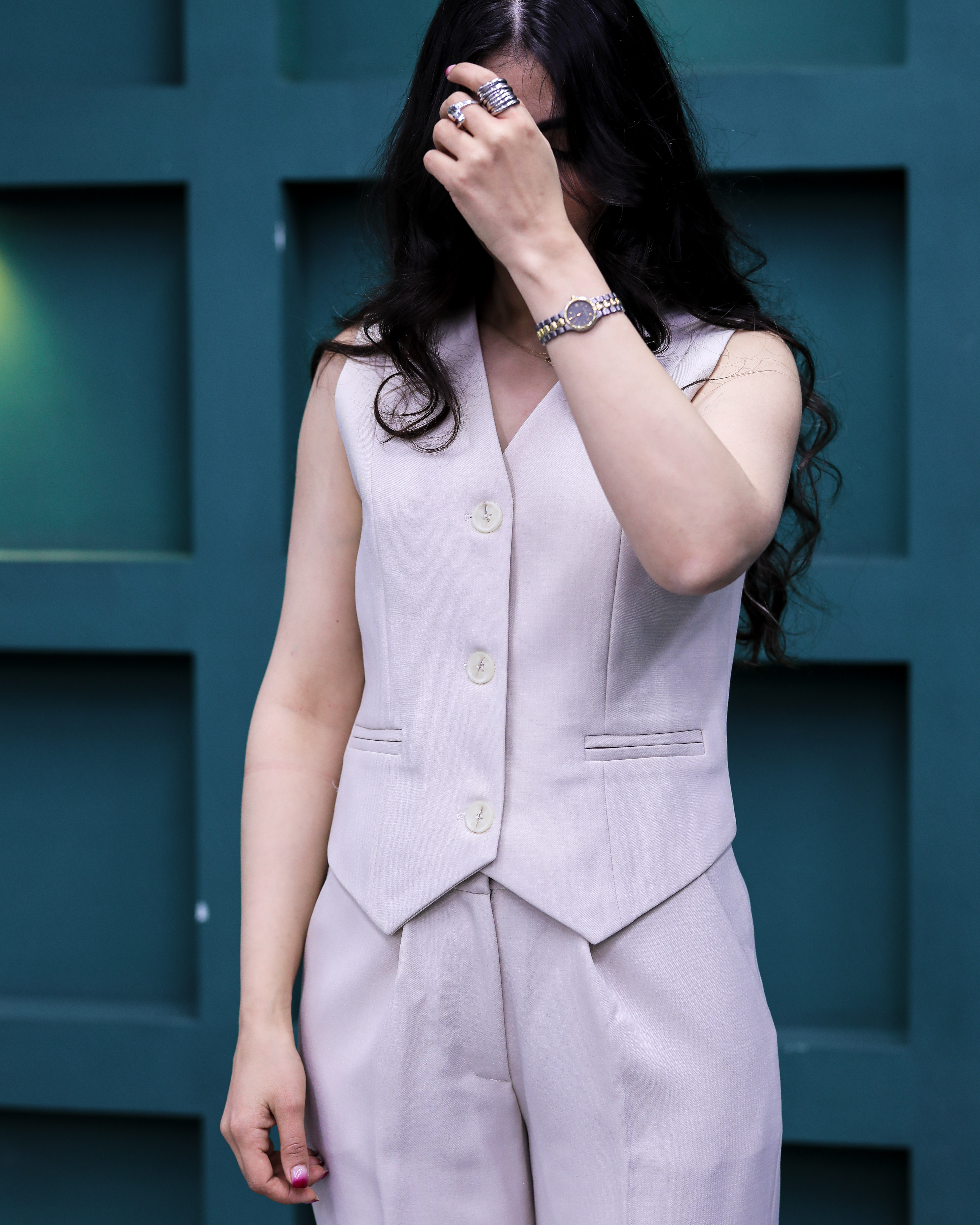 این جلیقه از پارچه کرپ کارتیر باکیفیت دوخته شده و با رنگ کرم ملایم، بهراحتی با انواع شومیز، بلوز یا کت و شلوار ست میشود.