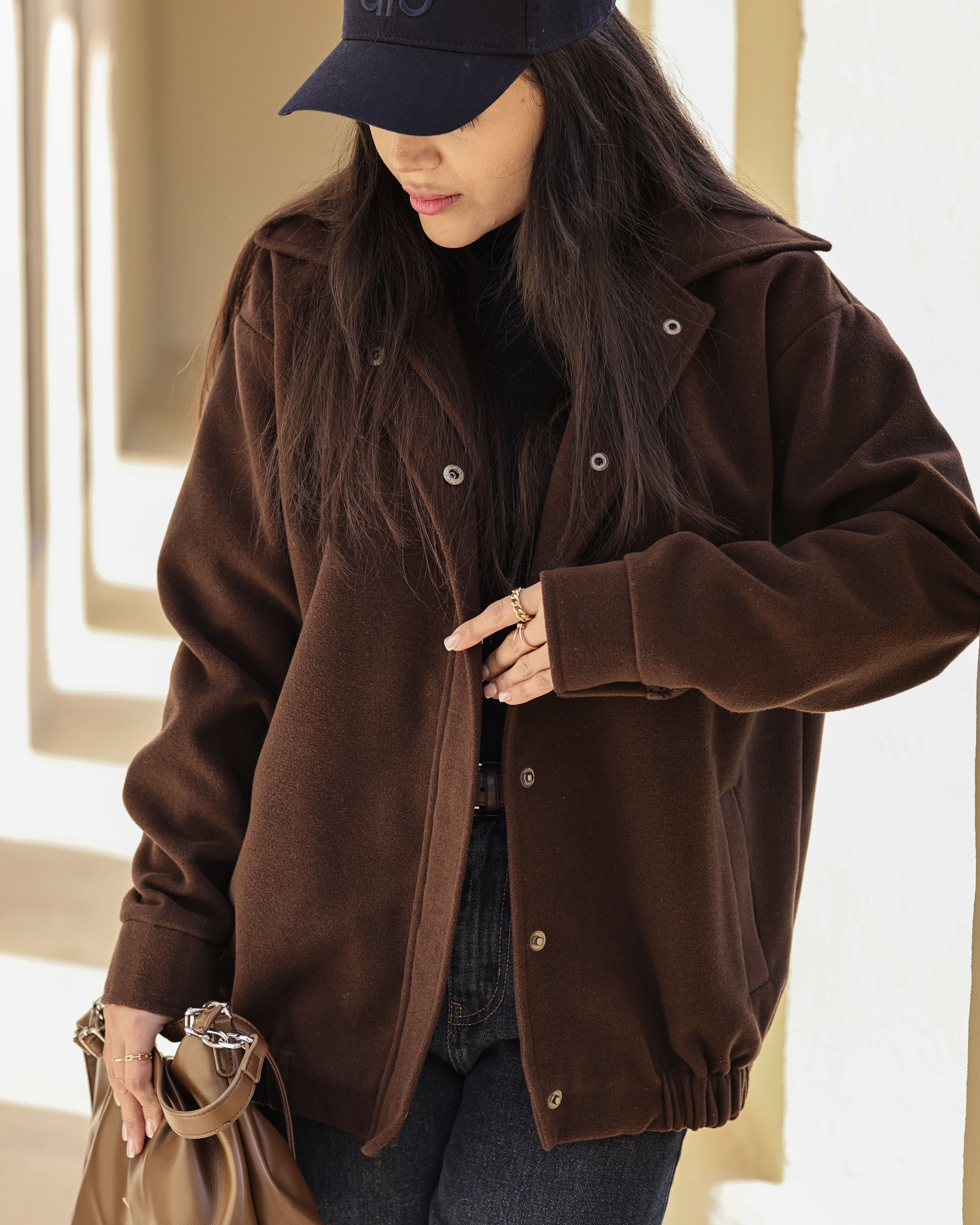 این بامبر جکت با رنگ قهوهای گرم، به راحتی با شلوار، دامن یا شلوارکهای پاییزی و زمستانی ست میشود و گزینهای ایدهآل برای استایل روزمره و نیمهرسمی است.
