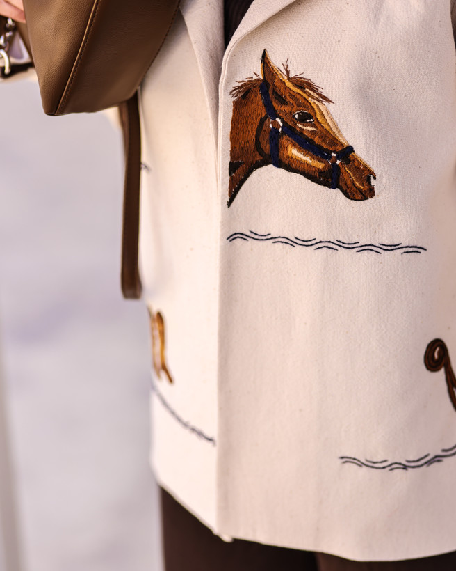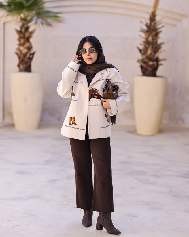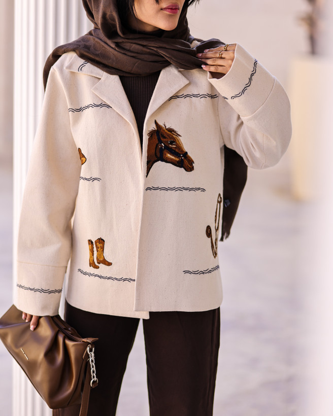 این کت دستدوز با الهام از نقوش اصیل سوارکاری و شکوه اسب، تلفیقی از هنر، ظرافت و هویت شرقی است. پارچهی استفادهشده لینن ازبک با بافت طبیعی، تنفسپذیر و ایستایی شیک، انتخابی ایدهآل برای استایلهای هنری و خاص به شمار میرود.