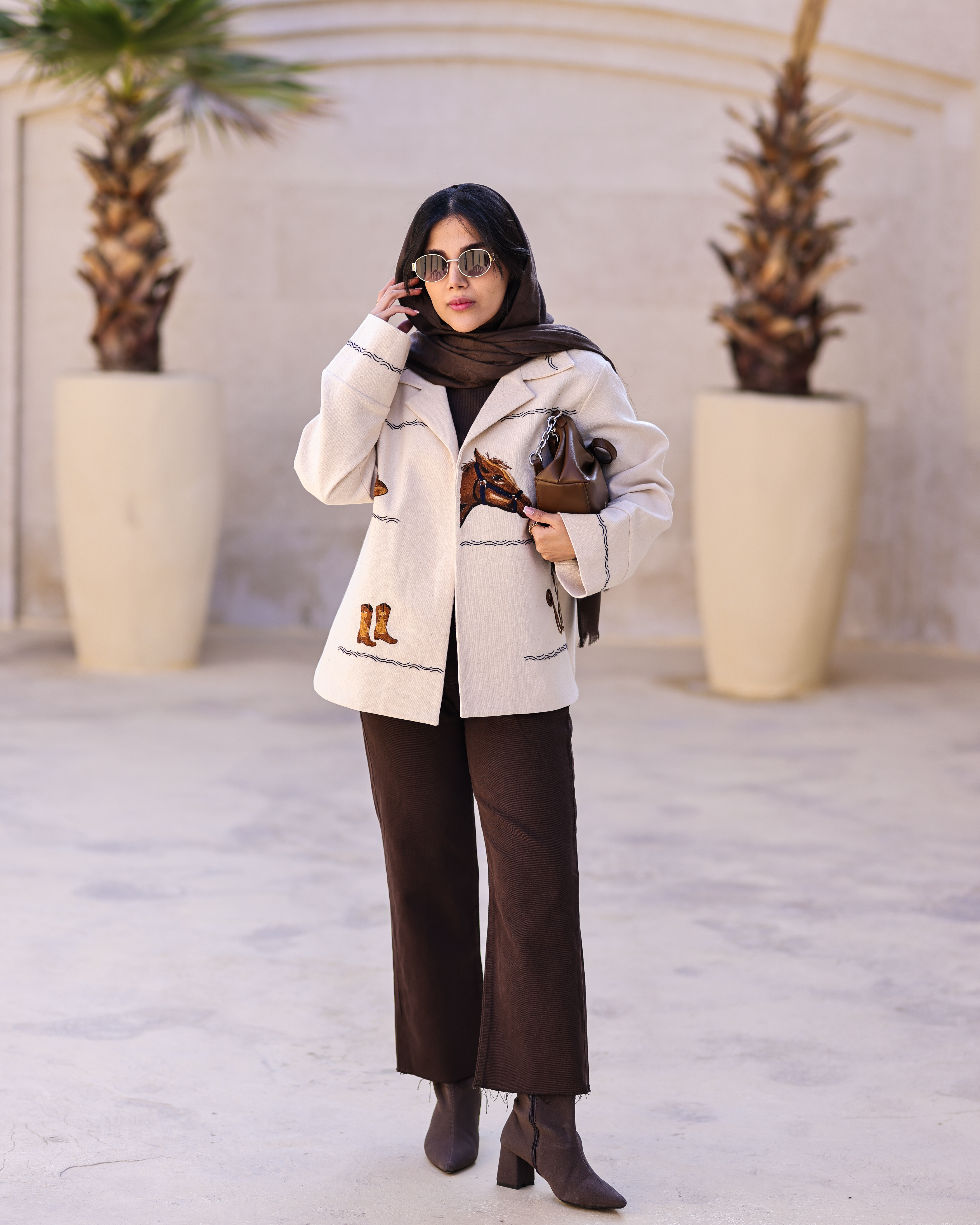 تمامی جزئیات طرح بهصورت دستدوز اجرا شده و همین موضوع، هر قطعه را به اثری منحصربهفرد تبدیل میکند. این کت مناسب استایلهای نیمهرسمی، هنری و حتی مهمانیهای خاص است و بهراحتی با شلوار پارچهای، دامن یا استایل مونوکروم ست میشود.