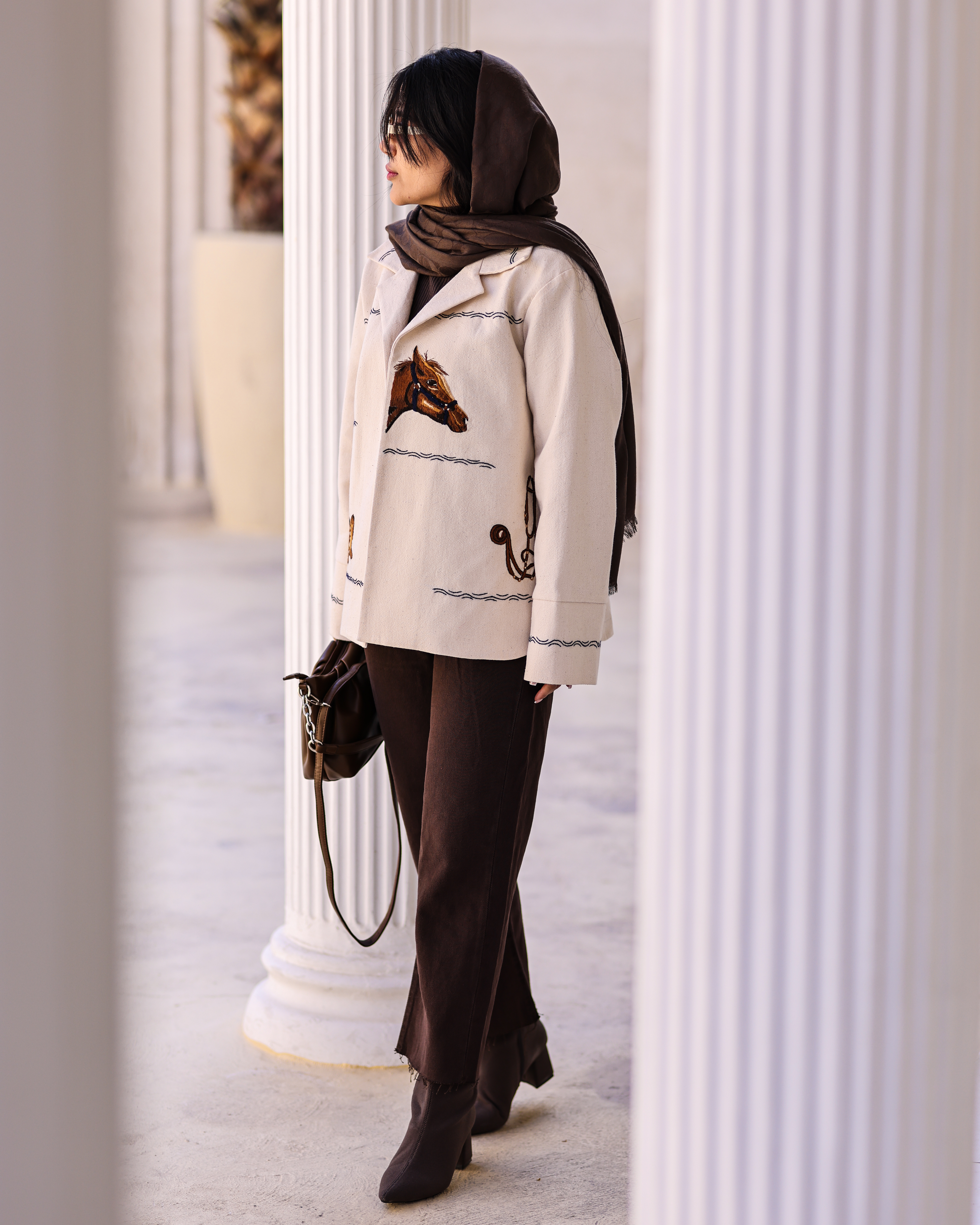 این کت دستدوز با الهام از نقوش اصیل سوارکاری و شکوه اسب، تلفیقی از هنر، ظرافت و هویت شرقی است. پارچهی استفادهشده لینن ازبک با بافت طبیعی، تنفسپذیر و ایستایی شیک، انتخابی ایدهآل برای استایلهای هنری و خاص به شمار میرود.