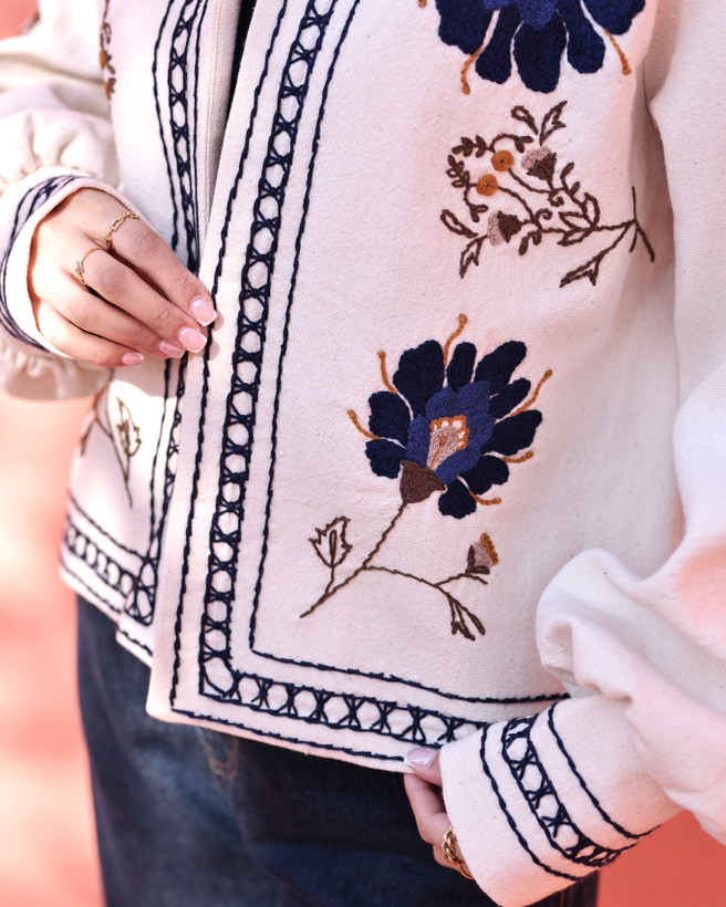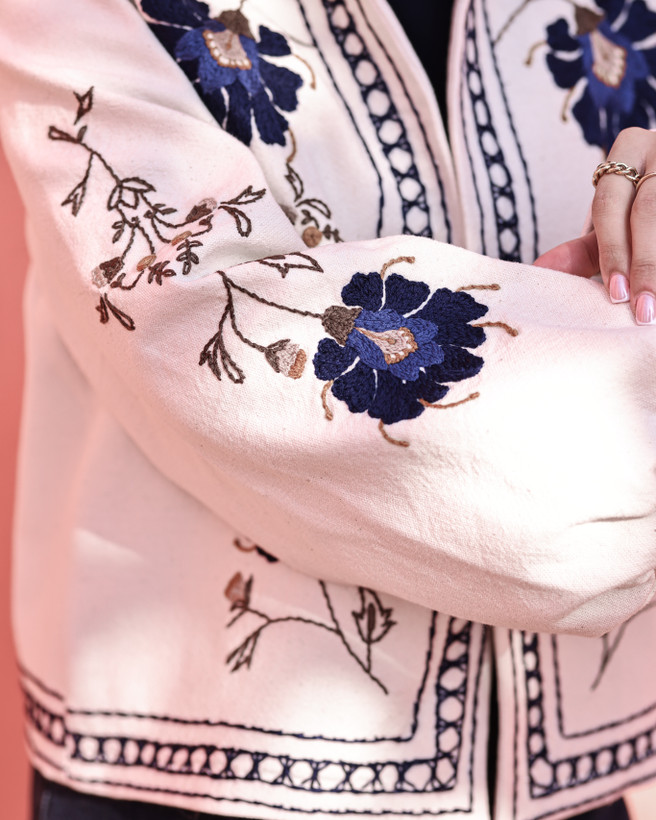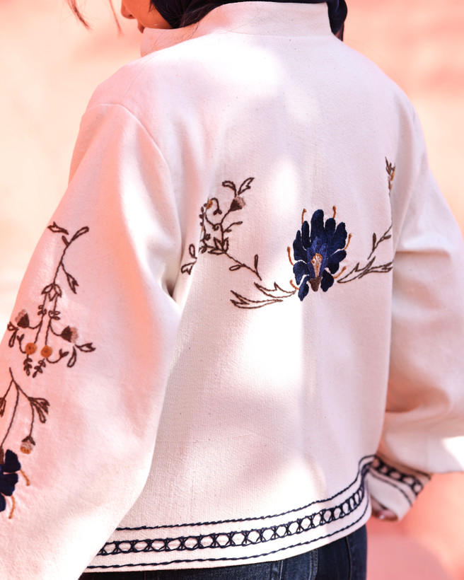 این کت دستدوز گلدوزی شده با نقش گلهای الهامگرفته از طبیعت، کاملاً با دست و با ظرافت بالا دوخته و اجرا شده است. هر قطعه از این کار یک اثر هنری یکتا است و به دلیل اجرای دستی، هیچ دو مدلی کاملاً مشابه هم نخواهند بود.