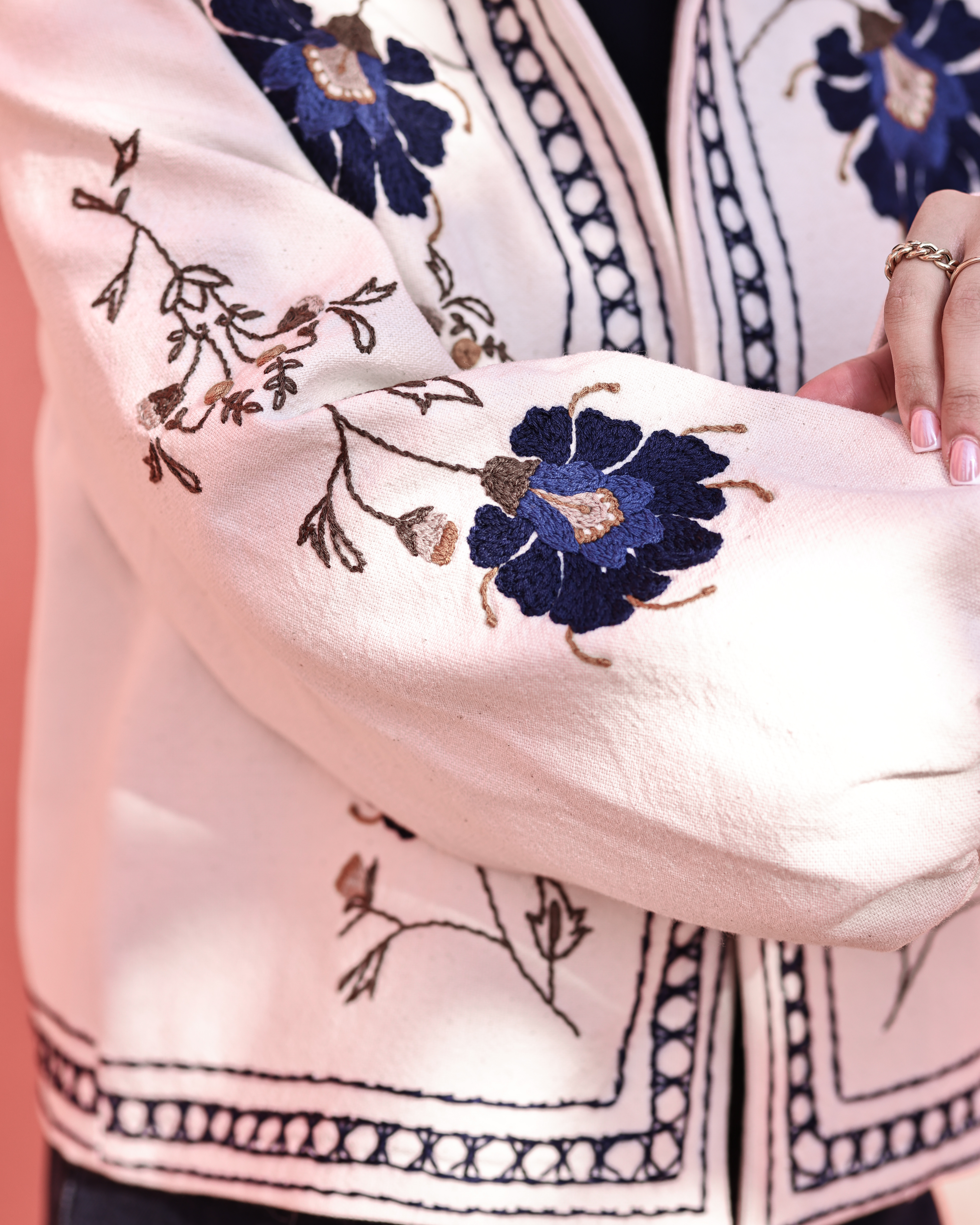 این کت دستدوز گلدوزی شده با نقش گلهای الهامگرفته از طبیعت، کاملاً با دست و با ظرافت بالا دوخته و اجرا شده است. هر قطعه از این کار یک اثر هنری یکتا است و به دلیل اجرای دستی، هیچ دو مدلی کاملاً مشابه هم نخواهند بود.